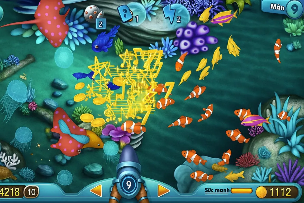 Điểm không đến ngẫu nhiên, nó là tích của ba lớp: (1) Điểm cơ bản gán theo loài – kích cỡ; (2) Hệ số cá phản ánh độ hiếm/khó; (3) Modifier nhân thêm từ đạn xuyên/đạn nổ, buff giờ vàng, hay combo bắn trúng liên tiếp. Combo thường có ngưỡng: mỗi chuỗi trúng trong thời gian T tăng một cấp, hụt hoặc đổi mục tiêu quá chậm sẽ hạ cấp/reset. Vì vậy, chiến lược phổ biến là “mồi combo” bằng đàn cá nhỏ (dễ trúng – rẻ đạn), rồi chèn cá trung bình ở góc trống để nhân điểm; chỉ dồn vào cá lớn/boss khi có góc thuận + đạn/buff sẵn + ít nhiễu nền. Đừng để modifier bị “chết” ở mép màn: khi mục tiêu sắp thoát khỏi khung, dừng bắn để bảo toàn combo.